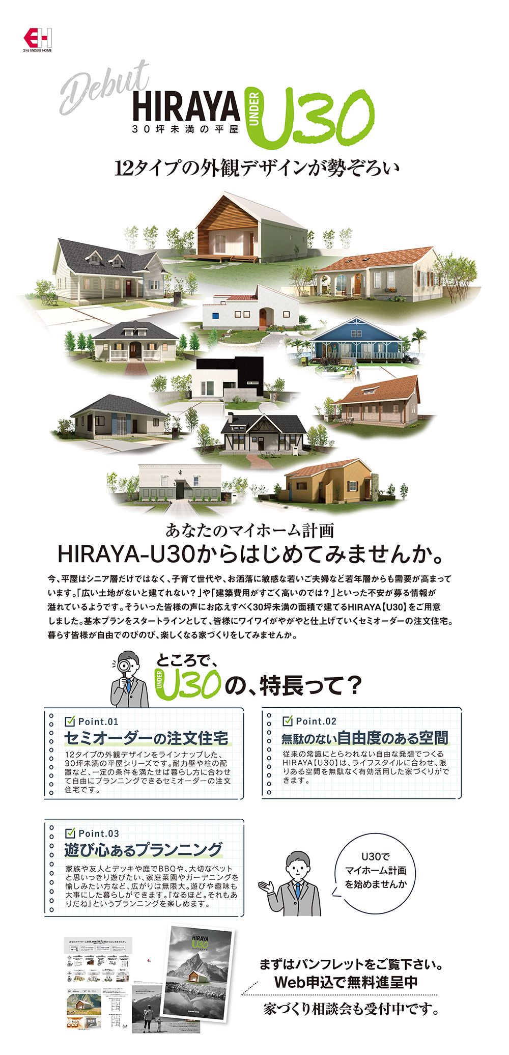 従来の常識にとらわれない自由な発想で、ライフスタイルに合わせ、限りある空間を無駄なく有効活用した、30坪未満の面積で建てるHIRAYA【U30】。 自分らしい家づくりをお考えの方、平屋にご興味のある方にパンフレットを無料で差し上げます。家づくり相談会も同時に受付中です。まずはお気軽にお問い合わせ下さい。