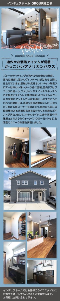 ブルーの外観が爽やかなM様邸。ヴィンテージ感漂う室内に無垢床やステンレス素材が調和。回遊動線や畳コーナー、乾燥機付き洗面など快適性にも優れたお洒落な住まい。