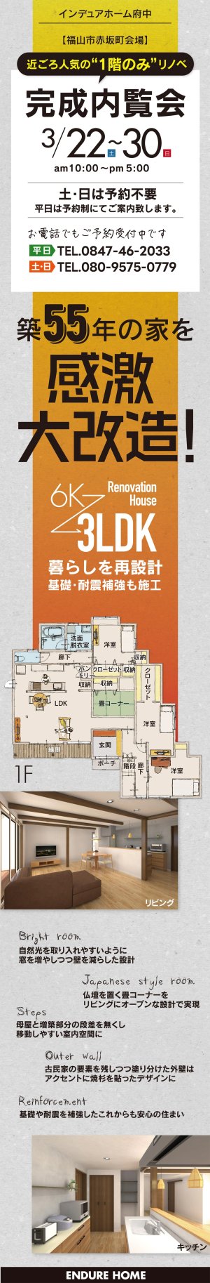 福山市赤坂町で、築55年の家を感激大改造!リノベーションハウスの完成内覧会を開催致します。