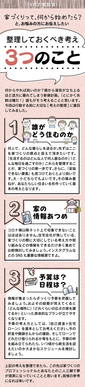 新築計画で失敗しないために、行動前に考えを整理することが重要。今回は家づくりの出発点として押さえるべき3つの視点を解説します。