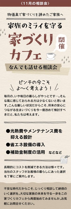 物価高で家づくりをあきらめかけている方へ。光熱費やメンテナンス費を抑える設計、省エネ設備や補助金活用など、長期的に安心して暮らせる住まいの工夫をお伝えします。家族の未来を守る「家づくりカフェ」開催中です。